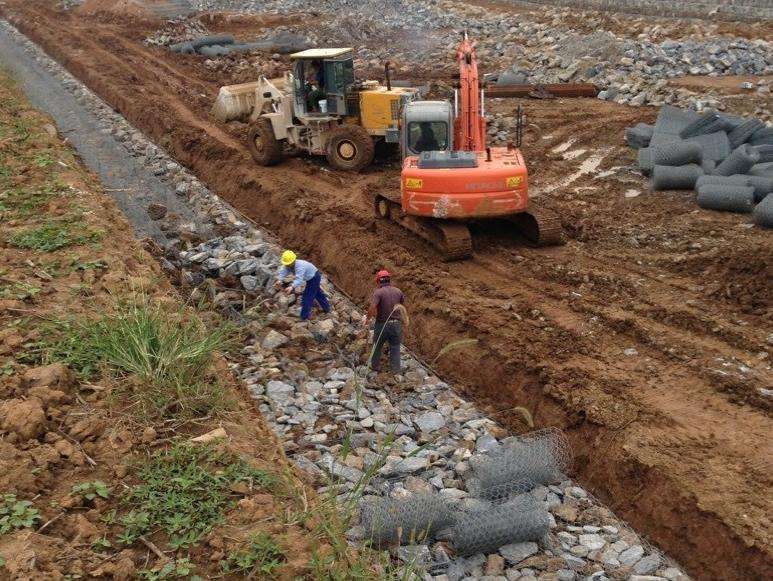 2 雷諾護(hù)墊施工過程應(yīng)符合如下要求: 雷諾護(hù)墊在鋪設(shè)前需進(jìn)行組裝 嚴(yán)格按照相關(guān)要求對(duì)護(hù)墊進(jìn)行展開、對(duì)沒有折痕的隔板、邊板用人工折、 用 15cm 鋼絲絞合隔板與邊板交疊的地方 組裝好的雷諾護(hù)墊形狀規(guī)則、線條直順、絞合點(diǎn)牢固。 除極小的溝渠外護(hù)墊長邊應(yīng)與坡面方向垂直; 當(dāng)護(hù)墊放在陡坡上(坡比大于 1:1.5) ,需用硬木樁在坡頂進(jìn)行 固定木樁入土深度至少應(yīng) 25cm,也可采用現(xiàn)澆混凝土平臺(tái)進(jìn)行固定;所有護(hù)墊必需緊靠、整齊、并且用短鋼絲固定相鄰護(hù)墊。 雷諾護(hù)墊的石料填充應(yīng)滿足以下要求 \裝填雷諾護(hù)墊所用的石料尺寸應(yīng)在 75mm~150mm; 當(dāng)使用大尺寸石料填充時(shí),應(yīng)根據(jù)雷諾護(hù)墊的高度確保至少裝填 兩層石料;石料裝填必需飽滿,并且達(dá)到設(shè)計(jì)厚度,特別注意每個(gè)方框的四 個(gè)角點(diǎn)以及坡上隔板上下兩端石料的裝填; 表面需要用人工進(jìn)行清平,將石料較為平整的面朝上,確保小到 每一個(gè)小方框,大到整個(gè)坡面,裝填完以后都在一個(gè)平面上,不存 在凸出和凹陷現(xiàn)象。