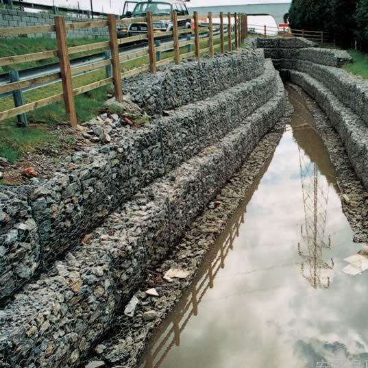 格賓網(wǎng)能有效制止海洋風浪對岸邊沖刷浸泡后造成的潰岸、退岸,它是用鋼絲(8#線)編制成網(wǎng)片,按設計要求尺寸在岸邊擺放,裝入塊石封閉成石籠,石籠與石籠連結(jié)成排,覆蓋著被海水沖刷的岸坡(陸上和水下),起著防水沖刷護岸固腳的功效,它是目前水利工程。