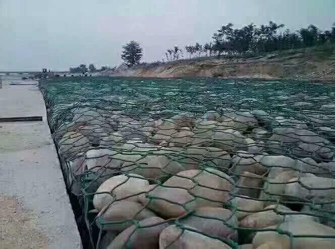 綠格網(wǎng)又稱“格賓網(wǎng)”、“石籠網(wǎng)”,由各種網(wǎng)孔規(guī)格的綠格網(wǎng)片按照ASTMA975-97規(guī)范組裝而成,工程現(xiàn)成填充石料組裝形成柔性的、透水的、整體的支擋結(jié)構(gòu),常用于生態(tài)防護(hù)工程。該結(jié)構(gòu)采用高熱鍍鋅鋼絲或者10%鋅鋁合金鋼絲經(jīng)過雙線絞合編織而成的,其雙線絞合部分的長度不能低于45mm,以保證絞合部分的防腐性能不被破壞。因?yàn)榄h(huán)境比較惡劣,污染比較嚴(yán)重,所以鋼絲的表面涂塑(包PVC或者PE)增強(qiáng)鋼絲的抗腐蝕性能。
