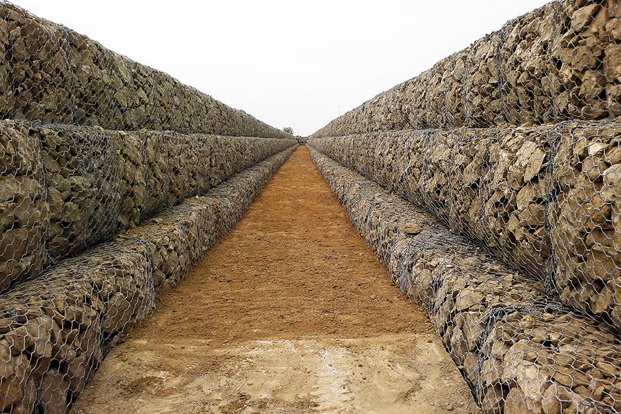 (3) 較好的抗沖性。六角網(wǎng)石籠用作護(hù)坡或擋墻工程,結(jié)構(gòu)整體性好。據(jù)有關(guān)試驗(yàn)證明,六角網(wǎng)石籠防護(hù)工程的防沖系數(shù)是一般拋石防護(hù)工程防沖系數(shù)的兩倍,且拋石護(hù)岸受水流沖擊時(shí),石頭受壓后,一旦產(chǎn)生初始移動(dòng),岸坡土壤被沖走,從而導(dǎo)致整個(gè)防護(hù)工程損壞。而石籠網(wǎng)墊防護(hù)工程中的塊石即使產(chǎn)生位移,此時(shí)變形后的護(hù)墊結(jié)構(gòu)將調(diào)整,達(dá)到新的平衡,而整體不會(huì)遭到破壞,從而有效保護(hù)岸坡土壤不遭破壞。