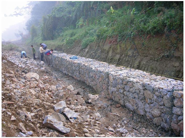 石籠網(wǎng)擋土墻,是石籠網(wǎng)籠子層疊堆砌的擋土建筑物。石籠網(wǎng)箱擋土墻的構(gòu)件是在網(wǎng)箱內(nèi)部填充大小比例相當?shù)氖瘔K,這樣就有一定的孔隙率,由于石塊之間的間隙,可以排出砌體后面的土壤和護坡下面土層的水,這樣就降低了水位,減少墻體后和坡下的地表水壓力,水及時排出降低了擋土墻被破壞的幾率,這樣擋土墻的壽命會大大的延長。同時墻體網(wǎng)箱是鐵絲網(wǎng)制作的籠子,能夠有一定的變形,況且,石塊與石塊之間,也可以滑動,所以擋土墻的變形能力也能夠緩沖突發(fā)的外力。