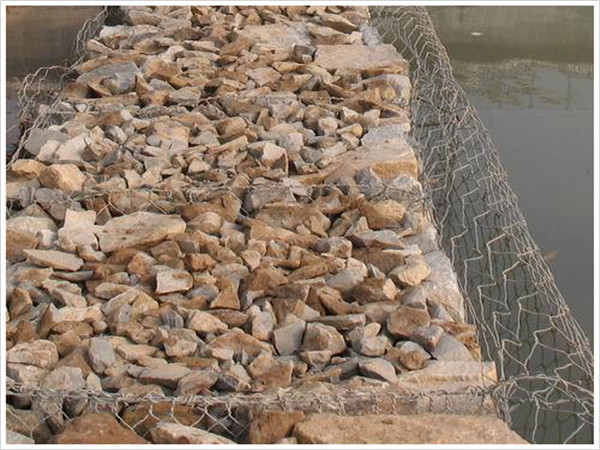 (3)將組長(zhǎng)好的籠體安裝在所需的位置上,并與相鄰的籠體綁扎連接,將準(zhǔn)備好的石塊或卵石填入籠中,要作適當(dāng)?shù)拇a排,以達(dá)到較高的密實(shí)度,石塊直徑一般須大于網(wǎng)目的兩倍,石塊要選用抗風(fēng)化能力強(qiáng)的石料。用拉筋來(lái)保持籠體形狀的規(guī)整,拉筋間距一般在300mm左右。