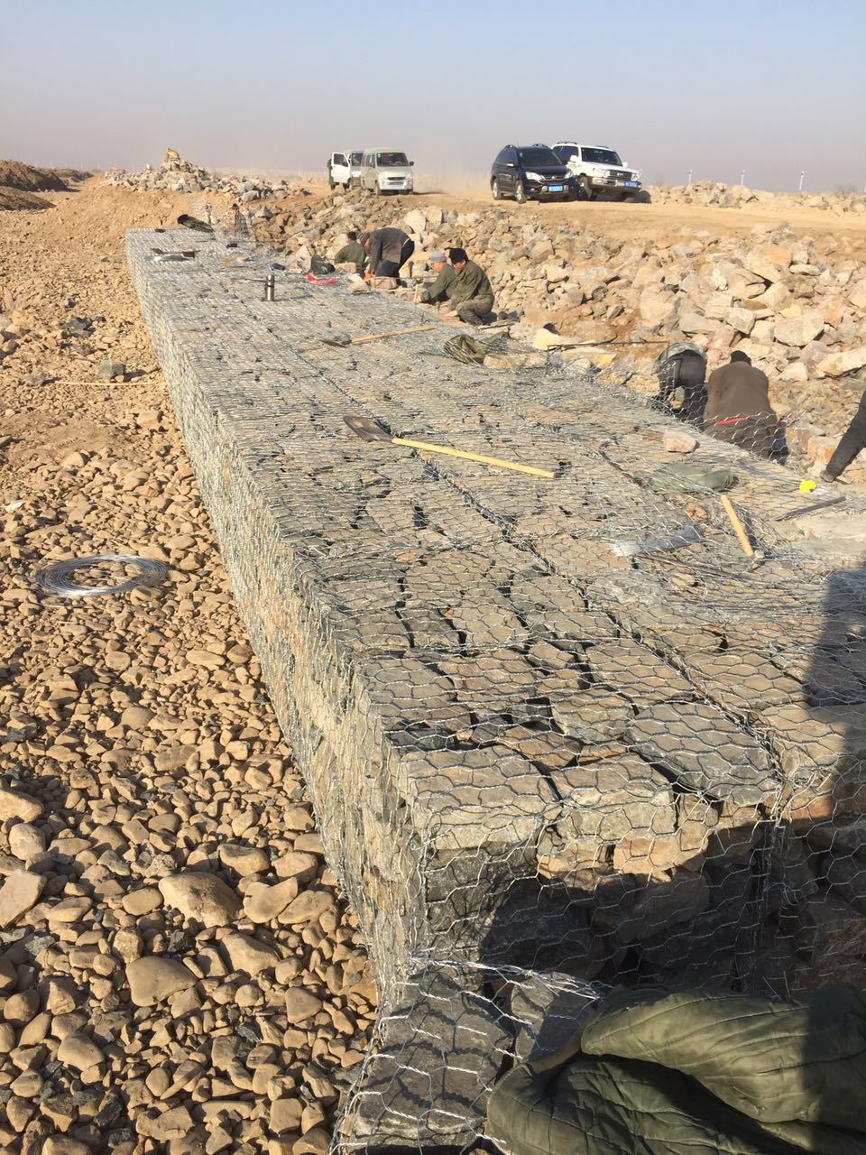 3、封蓋:封蓋時頂部石科必須砌壘平整,先固定每端相鄰邊節(jié)點后再綁扎,封蓋與網(wǎng)箱邊框相交線處每隔l0-15cm綁扎一道。毎層石籠網(wǎng)箱填石完成應擇點測量標高,達到設(shè)計要求。