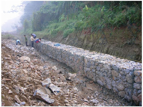 (5) 較好的柔韌性。石籠網(wǎng)片的原材料可采用涂膜熱鍍鋅低碳鋼絲,構成網(wǎng)格的鋼絲有一定的強度,不易被拉斷,箱籠整體強度較高。低碳鋼絲承受適度的變形特點,可以將全部工程連成整體,不需分縫,即使由于某種原因使結構中斷裂一根網(wǎng)絲,也不會影響結構的整體性。特別在受地基土沉陷或墻后土有小的變形影響時,結構能進行自身適應性的微調,不會因不均勻沉陷而產生沉陷縫等,整體結構不會遭到破壞。