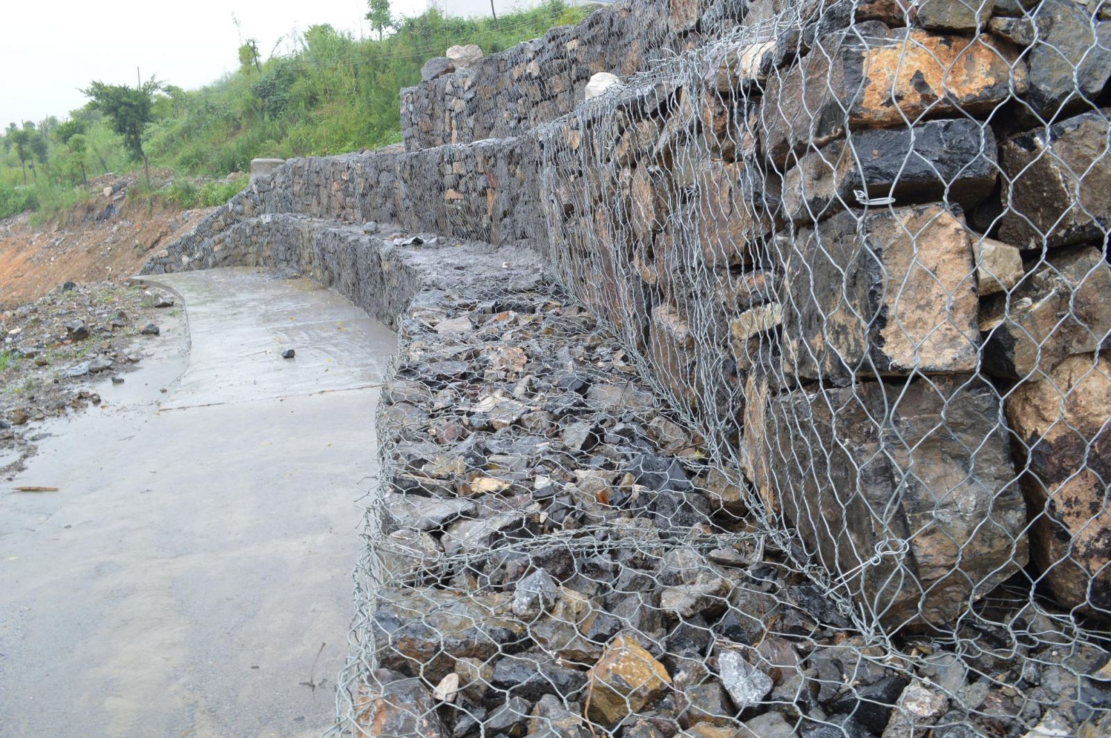 石籠網(wǎng)由高抗腐蝕、高強度、具有延展性的低碳鋼絲或者包覆PVC的以上鋼絲使用機械編織而成,使用該網(wǎng)制作而成的箱型結構就是石籠。根據(jù)ASTM和EN標準,所使用的低碳鋼絲直徑根據(jù)工程設計要求而不同。一般介于2.0-4.0mm之間,石籠網(wǎng)鋼絲的抗拉強度不少于38kg/m2,金屬鍍層重量一般高于245g/m2,石籠網(wǎng)片的邊緣線直徑一般要大于網(wǎng)線直徑。其雙線絞合部分的長度不得小于50mm.以保證絞合部分鋼絲的金屬鍍層和PVC鍍層不受破壞。